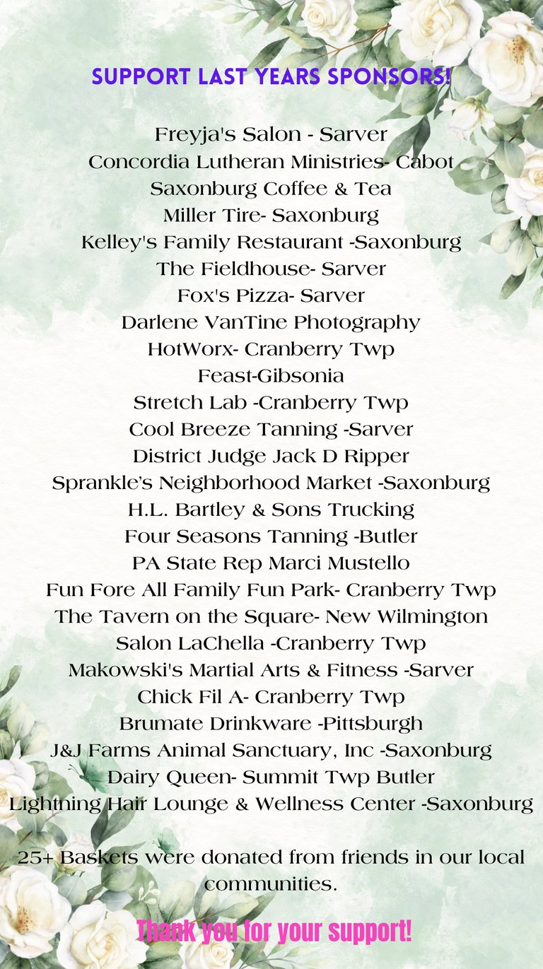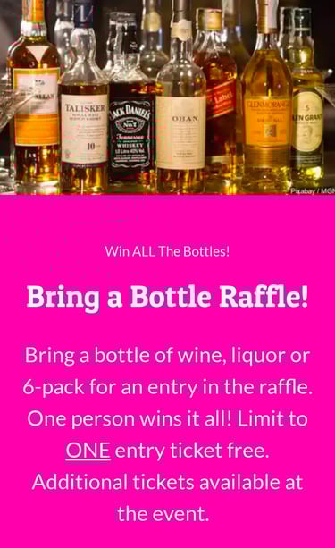 Ticket Includes: Event Admission. Hors d'oeuvres. soft drink & dessert. 5 numbers to win a purse drawn every 10 minutes. Opportunity for side raffles, auction baskets, pull tickets, specialty drinks & fun!